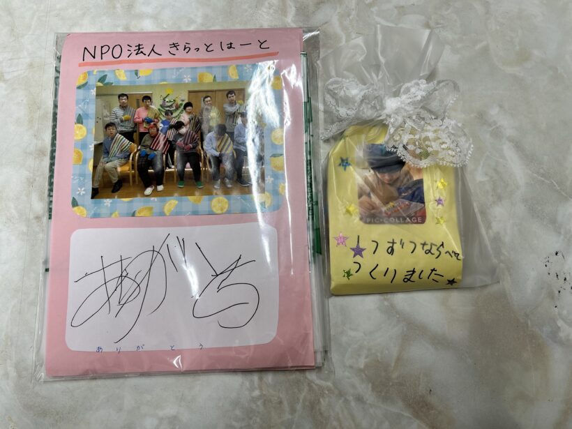 事業所さんからは、お礼にと、ご利用者さんが作成したコースターと感謝のメッセージをプレゼントして頂き、「喜んでいただけるのが一番うれしいし、大変励みになります。頑張って作ります!」とお話されました。
