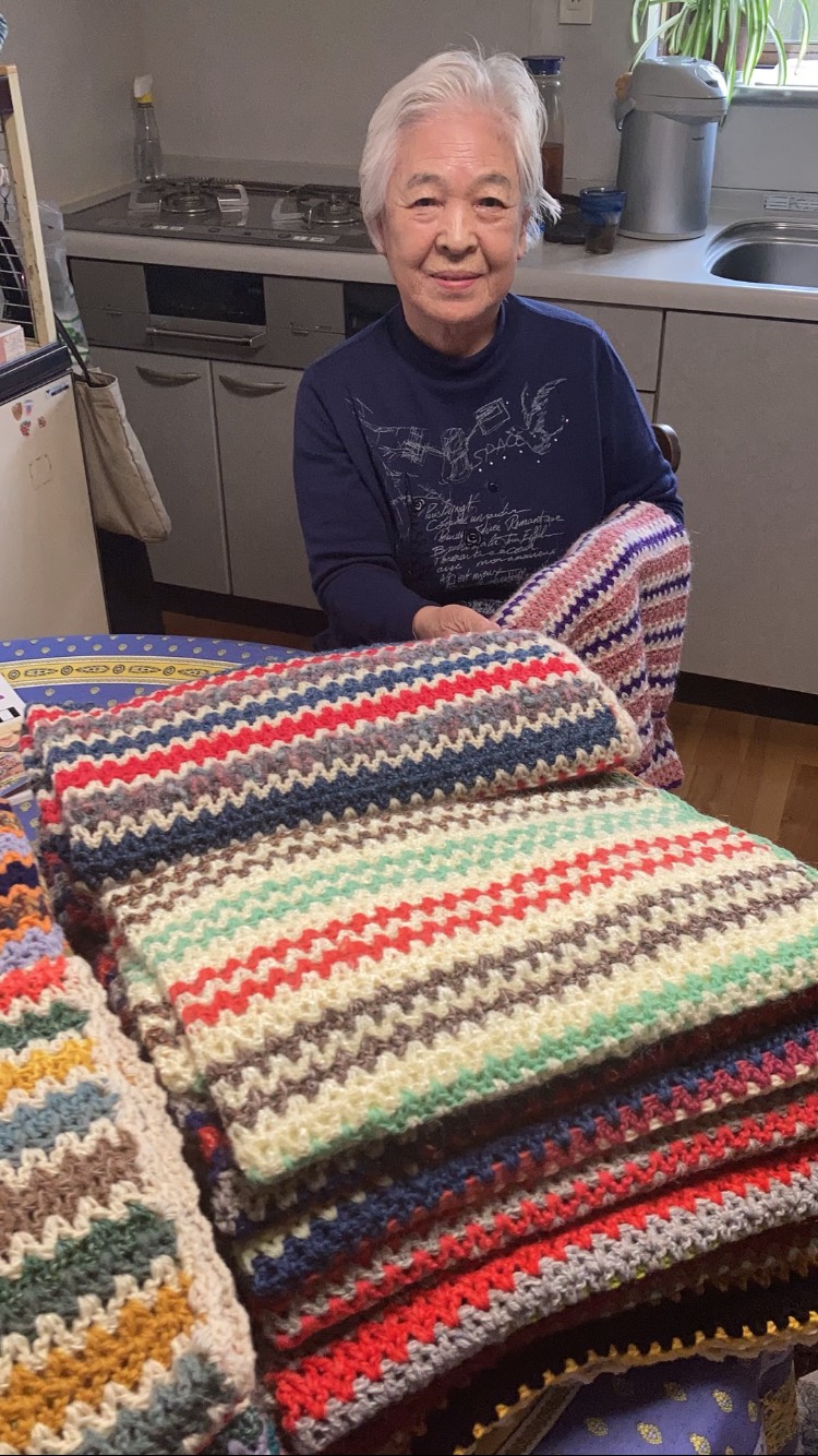 2年程継続した後、実母や夫の介護でお世話になっていたこともあり、市内の高齢者や障がい者施設にひざかけの寄付を始めました。ご自身であちこちに電話をかけて、需要のある福祉事業所に寄付をしました。