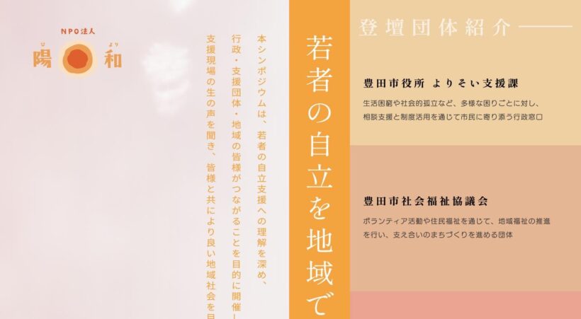 地域を支える行政や民間団体の取り組みの事例報告、そして若者支援の現場で見えてきた課題を共有しながら、地域としてどのように支えていけるのかを考えるシンポジウムです。