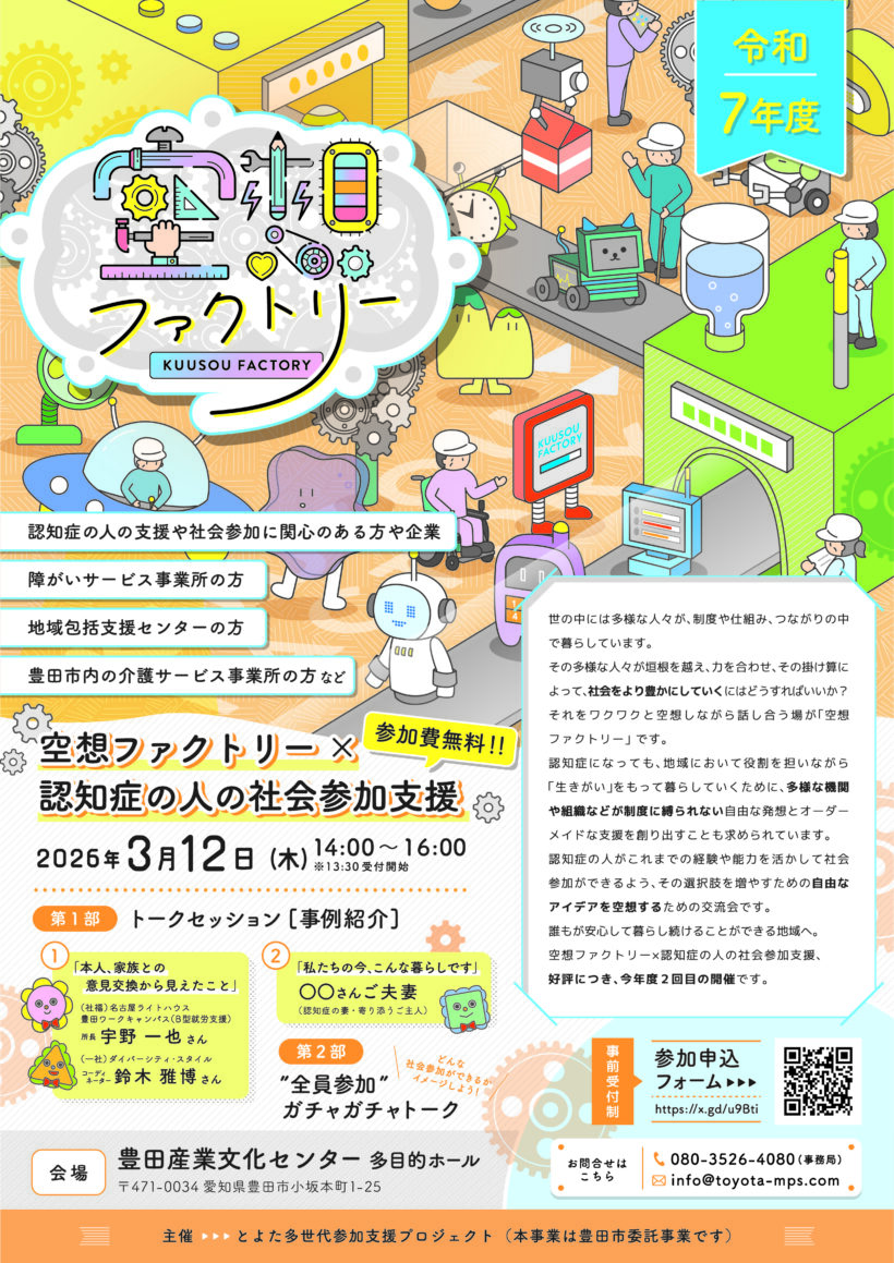 対象:認知症の人の支援や社会参加に関心のある方や企業、障がいサービス事業所、地域包括支援センター、豊田市内の介護サービス事業所の方など
